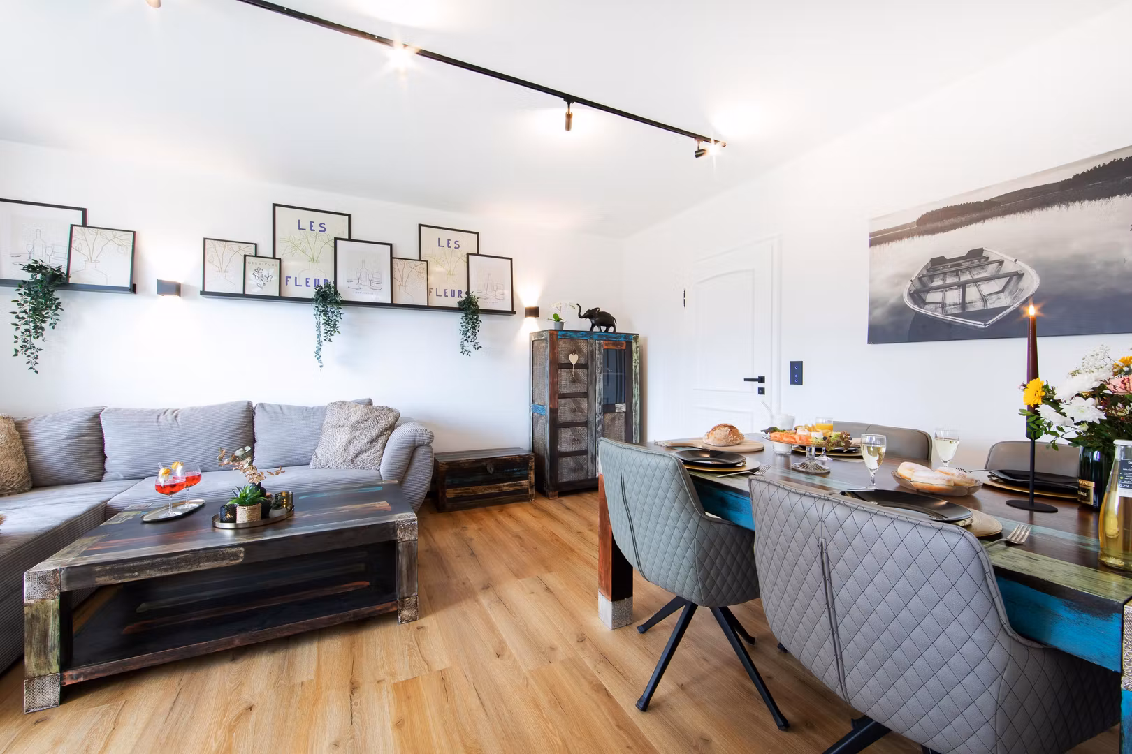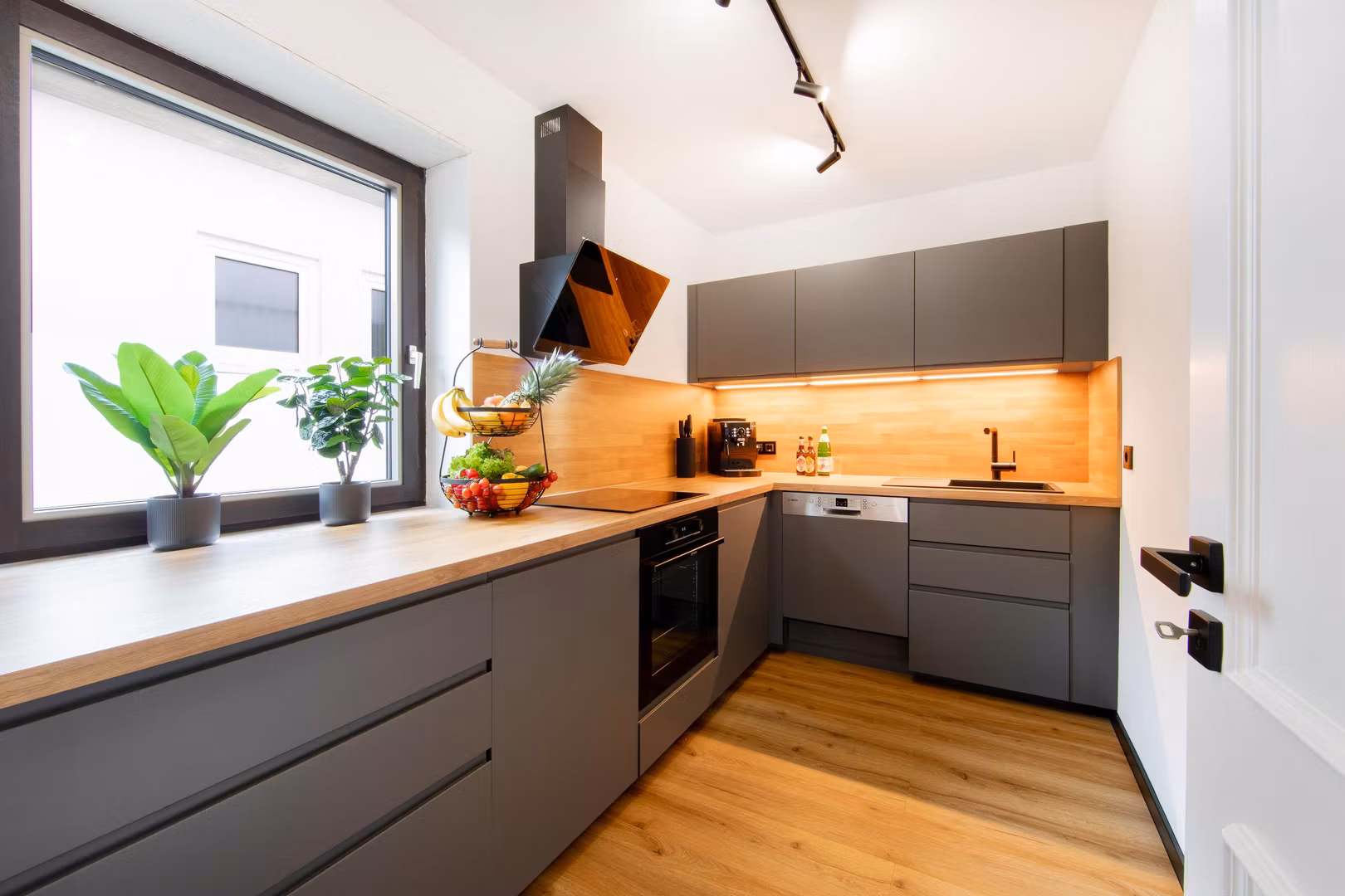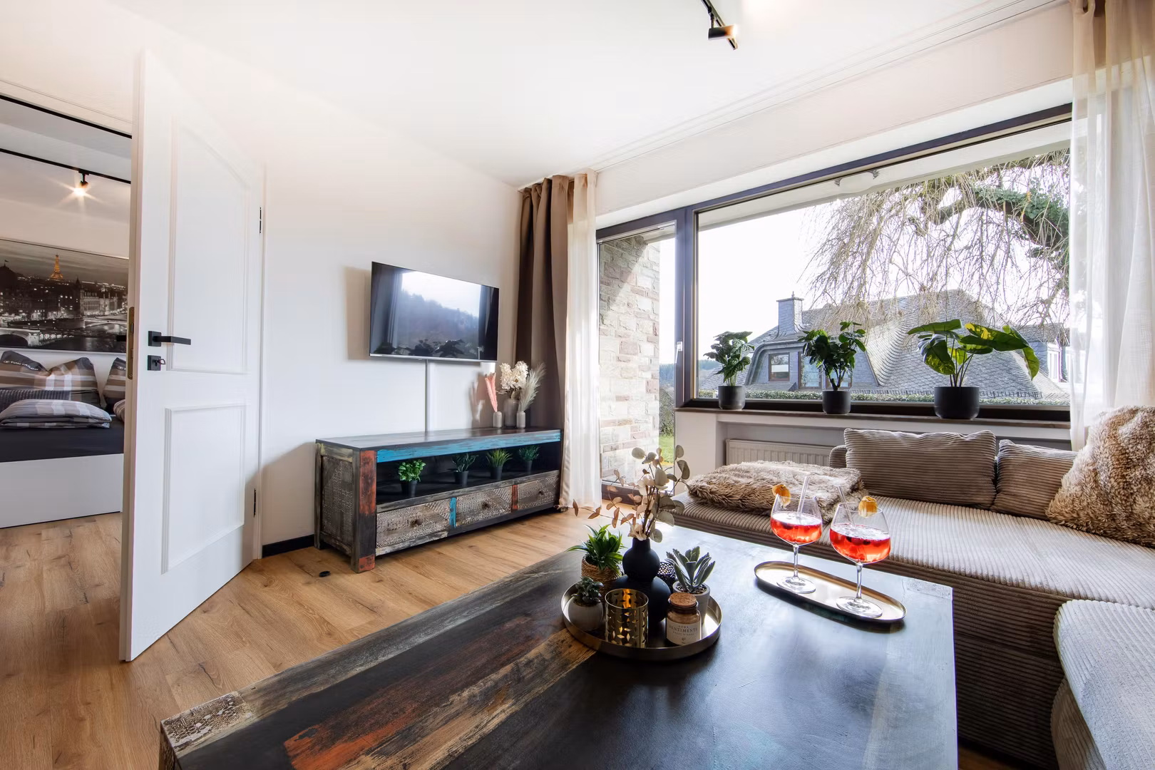 Die Wohnung verfügt über ein Wohnzimmer mit Smart-TV, Essbereich sowie eine moderne, voll ausgestattete Küche mit Herd, Backofen, Kühlschrank, Spülmaschine und Kaffeevollautomat. Kaffee und Tee stehen kostenfrei zur Verfügung.